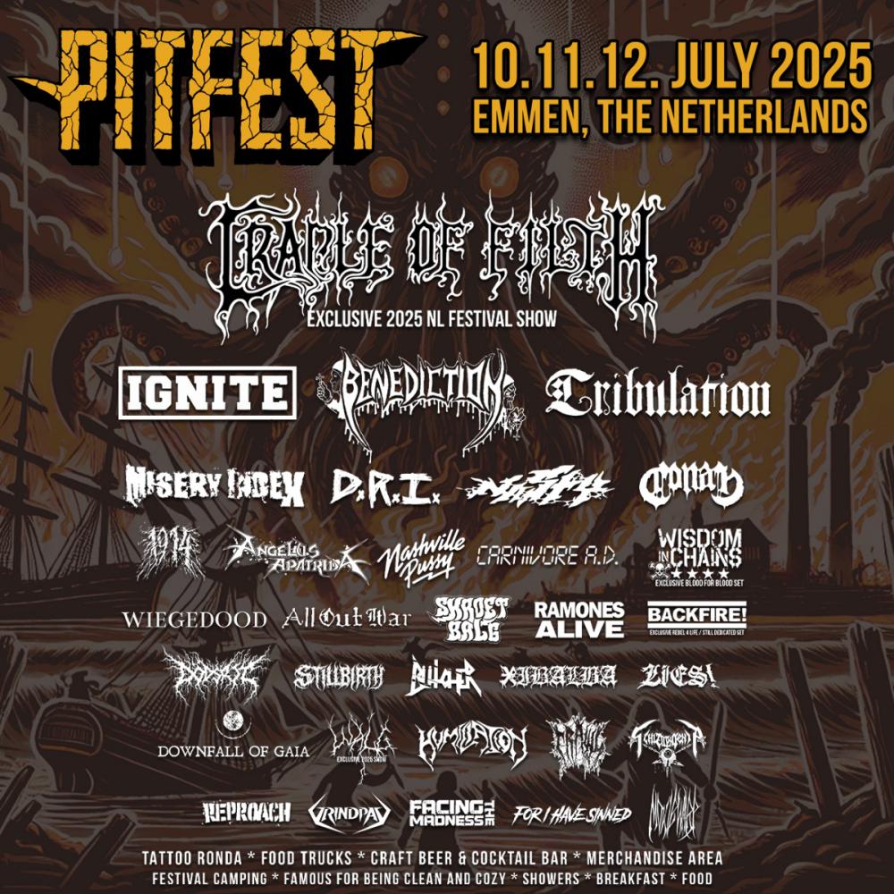 Pitfest wordt gehouden van 10 t/m 12 juli op het terrein van Rugbyclub Emmen. Naast Nashville Pussy kun je er ook onder meer Cradle Of Filth, Ignite, Misery Index, Tribulation, D.R.I., 1914, Wisdom in Chains, Benediction, Skroetbalg en Carnivore A.D. zien. Een weekendticket kost 109 euro, maar er zijn ook dagkaarten verkrijgbaar. Alle informatie vind je op www.pitfest.nl.