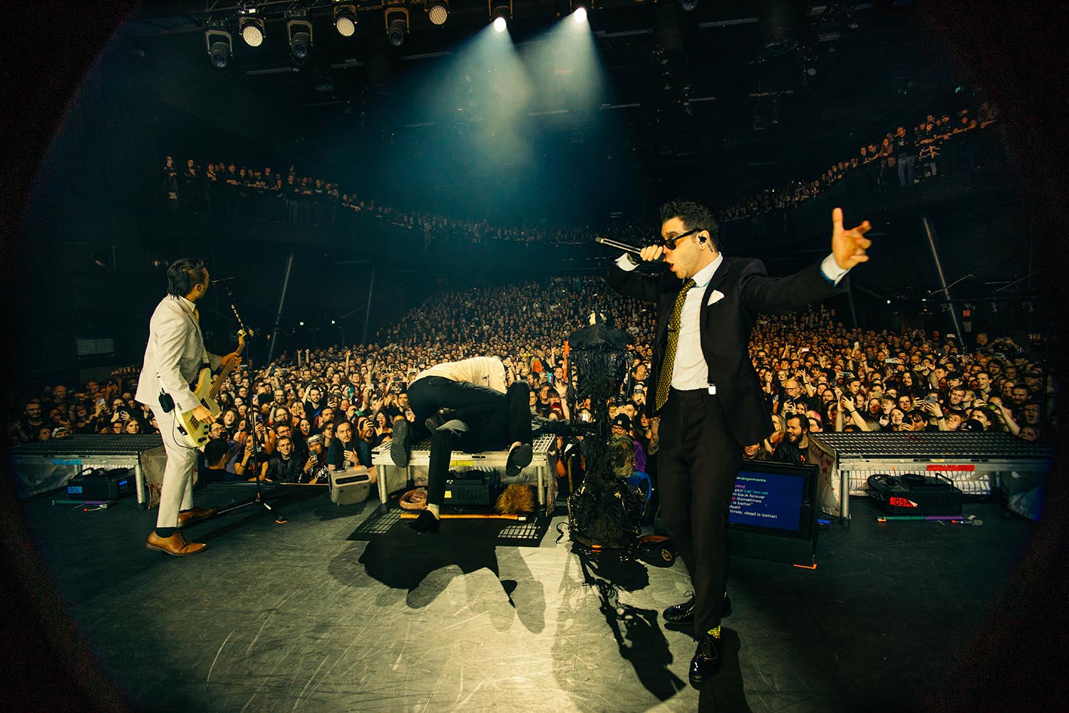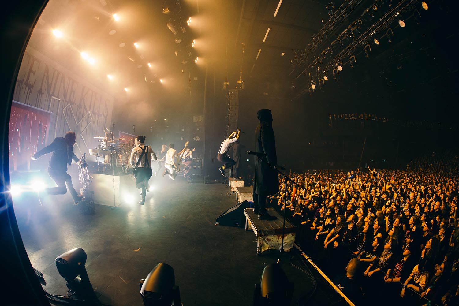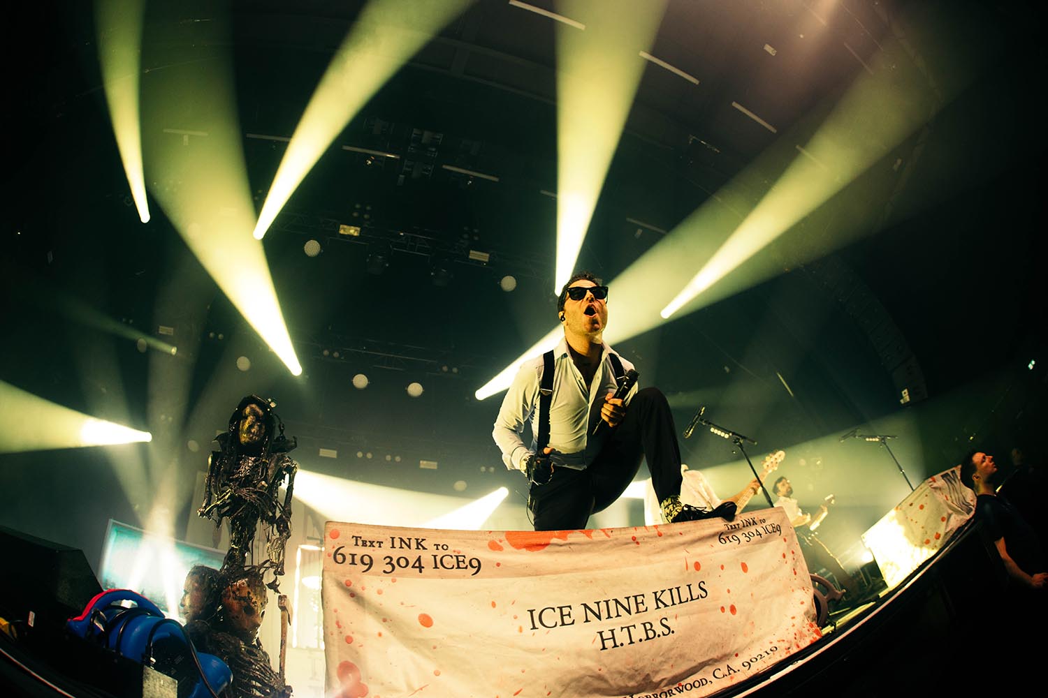 Op het podium is het uit Boston afkomstige Ice Nine Kills in ieder geval vandaag weer heer en meester. Wanneer de groep aanvangt met zijn optreden is de zaal propvol en staan er zelfs mensen aan de zijkant in de gang te kijken (al is er op de trappen nog wel plek). Met het formidabele en op Silence Of The Lambs geïnspireerde Meat & Great wordt afgetrapt. Het geluid is nog niet optimaal en vooral de bas en drums overheersen en dat duurt een aantal tracks voordat dit goed staat. Het is frontman Spencer Charnas die met zijn charisma gemakkelijk alle aandacht naar zich toe trekt. Cool en met klasse loopt hij in een pak en met een zonnebril op over het podium en met ogenschijnlijk gemak spuwt hij zijn teksten eruit. Naast hem is het de psychopaat Hannibal Lecter die de aandacht steelt. Met zijn beruchte mondkap staat hij omringd door bewakers (net al in de film) geparkeerd en vastgeketend op een steekwagen op het podium. Uiteraard breekt hij los en is het vervolgens een bloederig tafereel hoe hij de bewakers aan hun einde laat komen. Zo blijkt vandaag bijna elke track die gespeeld gaat worden zijn eigen macabre voorstelling erbij te krijgen.