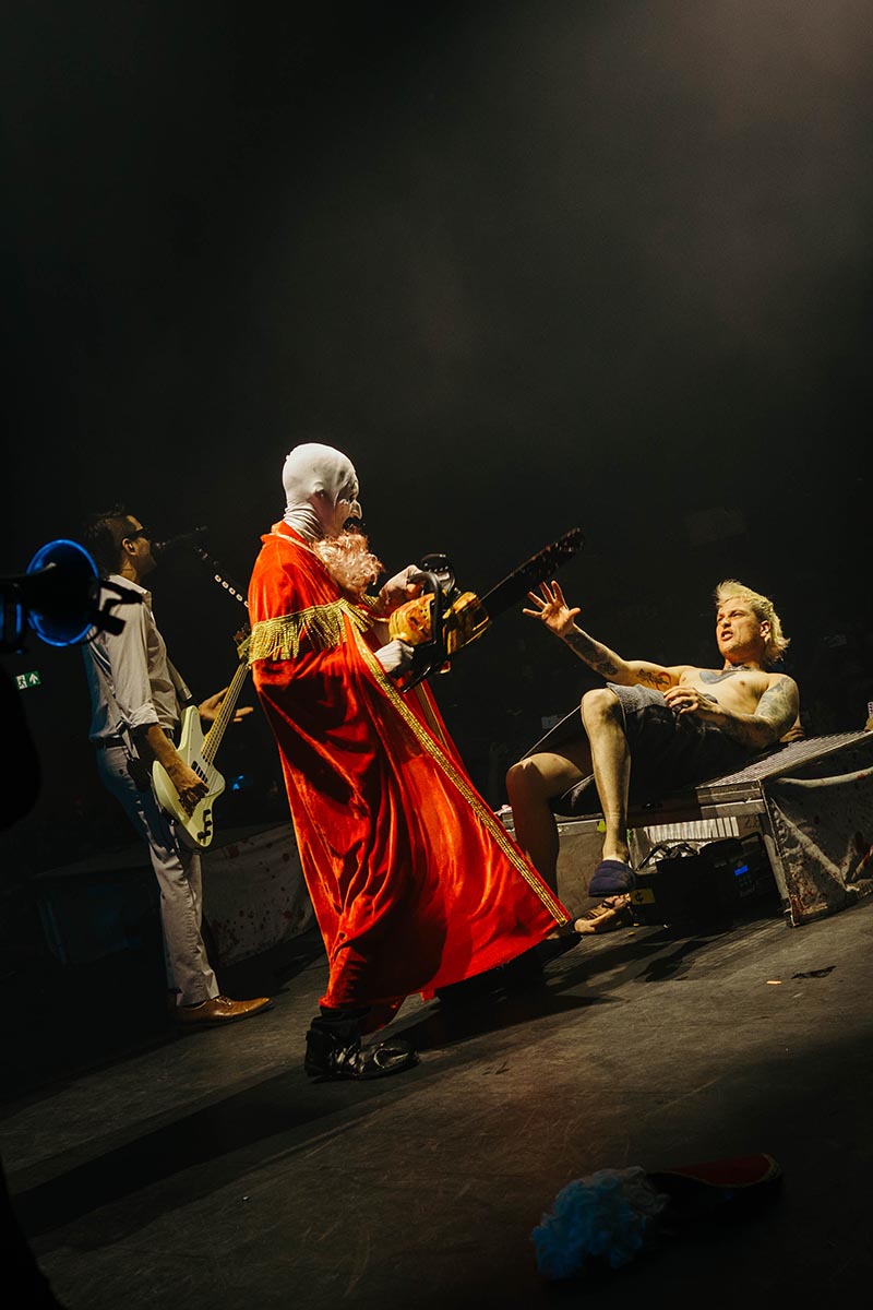 Ice Nine Kills neemt vandaag dan ook flink de tijd en presenteert vandaag maar liefst negentien tracks aan het publiek. Het fijne is dat de groep ook een aantal verrassingen in petto heeft. Zo zijn enkele bandleden van de punkrockband Real Big Fish mee op tournee en die voorzien de tracks van blazers en zodoende komt de feestelijke samenwerkingscover Walking On Sunshine voorbij, maar wordt er met The Impression That I Get ook nog een cover gespeeld van de eveneens uit Boston afkomstige formatie The Mighty Bosstones. Met Farewell II Flesh brengt de groep vervolgens de toeschouwers nog even in verwarring. Het oude en ook niet bijster interessante nummer is onbekend bij het gros en dit zorgt er even voor dat de energie wegebt. Daarbij is dit ook het enige nummer dat geen vorm van theater heeft. Opvallend genoeg zijn het de recente singles die wellicht de meeste respons krijgen. Vooral het op Batman-geïnspireerde The Laugh Track zorgt voor een feest op zowel het podium als in het publiek en het is de maniakale afsluiter A Work Of Art die alle registers los gooit met horror-icoon Art The Clown in sinterklaaskostuum, die vervolgens meerdere mensen op het podium gruwelijk en goor vermoordt.